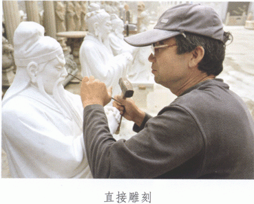 直接雕刻就是不用石雕麒麟貔貅等模型,完全由雕刻者根據(jù)圖紙或心中想象直接雕刻成形。這種方法靈活性較大,可以根據(jù)石料因材施雕。嘉祥石雕一般以三次成型法而完成,這直接決定了嘉祥石雕最終的藝術(shù)效果和雕刻特點(diǎn),直接雕刻分為選料、粗雕、二荒、定型、細(xì)雕、磨光、上蠟拋光等程序: