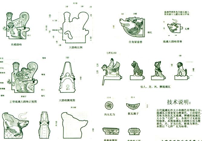 古代石雕牌坊建筑的屋頂都有脊獸。北京故宮角樓共有三百多個脊獸。最上面也是重要的脊獸稱:鴟吻。古代建筑中有許多似龍非龍的造像。民間也有各種傳說描述其形象。明代詩人李東陽《懷麓堂集》中記載:“龍生九子不成龍,各有所好。囚牛,平生好音樂,古琴頭上的雕刻獸是其遺像;睚毗(yazl),平生好殺,今刀柄上龍吞口是其遺像;嘲鳳,平生好險,今殿角走獸是其遺像;蒲牢,平生好鳴,今鐘上獸鈕是其遺像;狻猊(su a nnf),平生好坐,今佛座獅子是其遺像;霸下,平生好負重,今碑座獸是其遺像;狴犴(bi' an),平生好訟,今獄門上獅子頭是其遺像;?P屃(bixi),平生好文,今碑兩旁文龍是其遺像;鴟吻,平生好吞,今殿脊獸頭是其遺像,鴟吻也稱:鴟尾。唐代史書記載:“海有魚,虬(qi)尾似鴟,用以噴浪則降雨,.設鴟魚之像于屋脊,以厭(ya)火災。”故唐代屋脊只見鴟之鹿而不見魚之頭。
