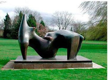 摩爾是成功運(yùn)用孔洞技術(shù)的雕塑家,孔洞的運(yùn)用打破了“雕塑是被空間所包圍著的實(shí)體”這樣一個(gè)西方傳統(tǒng)雕塑的固有概念。他讓空問穿透雕塑,使空間成為實(shí)體的一部分,讓雕塑與空間融為一體。國王與王后的眼睛是兩個(gè)被鏤空的孔洞,從側(cè)面看去透出明亮的天空,使得雕像在這種怪誕的處理中,流露出自然而神秘的、童話般的靈性感。這種獨(dú)特的造型語言在摩爾的那些斜倚的人體雕塑中運(yùn)用得更為廣泛而靈活,其胸、腹部往往都是鏤空的孔洞。有人把這種孔洞稱為“摩爾洞”。