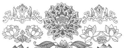 不過,后來的寶相花圖案則經(jīng)過了藝術(shù)加工,應(yīng)用在觀音雕刻上面一般以某種花卉(比如牡丹、蓮花等)為主體,中間鑲嵌形狀不同、大小粗細(xì)有別的其他花葉。尤其是其花蕊和花瓣基部、用圓珠作規(guī)則排列.恰似閃閃發(fā)光的寶珠,再加多層次退暈色,顯得珠光寶氣、富麗華貴,所以叫“寶相花”,又稱“寶仙花”、“寶花花”。總之,寶相花紋樣并非某種實有花卉形象的描摹,而是對多種現(xiàn)實題材集中、提煉而成,是一種獨特的、具有符一號意義的紋樣,是富貴占祥的象征。