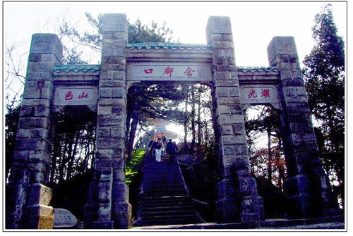 江西廬山石牌坊-含鄱口位于廬匕東谷含都嶺中央,海拔1211米,山麓是中國第一大淡水湖“鄂陽湖,”對面為廬山最高峰“漢陽峰”,北面為廬山第二高峰“大月山”,南面為廬山第三高峰“五老峰”,形成一個巨大壑口,山勢高峻,怪石嶙峋,對著山麓的都陽湖,似乎要把都陽湖二口吞下似的,故名含鄱口。