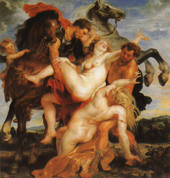 ??? 巴羅克繪畫大師魯本斯選用了一個搶婚的題材:希臘神話英雄卡斯托耳和波呂刻斯將留西帕斯的兩個女兒從睡夢中搶走。選用這一題材,并非就是為了表現(xiàn)搶婚,他是通過這一場面的渲染,,表現(xiàn)旺盛的生命力和劇烈的運動感。這是作品的主題所在。他不是突出搶的暴力,事件的是非也并非關(guān)鍵,他看重的恰是在這一搶婚沖突中顯現(xiàn)的力量、動勢。?畫家描繪的是強拉上馬的場面,動勢明顯,既緊張凝結(jié)又伸展縱放。男子伸開手臂奮力拽拉,女子身體外展使勁掙脫。拽拉與掙脫,一向上與向下,向內(nèi)與向外,形成力與力的沖突后仰的女子軀體像拉開的弓一般繃緊。伸張的手臂,高昂的馬頭,揚起的馬蹄,又顯出放射狀的張勢。