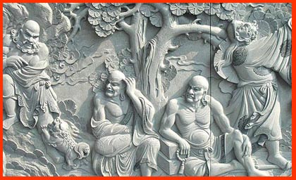 清代的石雕逐漸改變明代樸質(zhì)、單純的古拙風(fēng)格,趨向于細(xì)膩繁復(fù),注重情節(jié)目布局嚴(yán)謹(jǐn)。在一塊方不盈尺的磚而上,綜合運(yùn)用了浮雕、圓雕、鏤空雕等手法,往往可以透雕出幾個(gè)層次。上海書隱樓以石雕裝飾聞名于世。雙面石雕《八仙圖》,在正面雕刻了八位仙人在松樹旁聚會(huì),背面則雕刻了曳翩福與彩圖案?!段鞑ハL賢》是一幅長(zhǎng)卷式的石雕圖,雕有各種人物32個(gè),姿態(tài)各異?!赌峦醭?jiàn)西王母》、《老子騎青牛出函谷關(guān)》兩塊石雕同樣富有立體感。