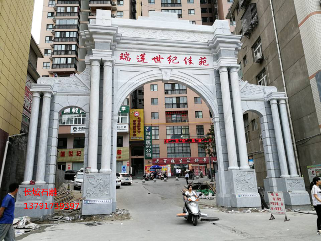 ??? 第三,鄉(xiāng)村石牌樓也有歐式古典牌坊樣式的。那樣的鄉(xiāng)村牌坊具備一種物品合璧的藝術(shù)美,選用傳統(tǒng)式的石牌坊方式,隨后在建筑類型上選用歐式古典的設(shè)計(jì)構(gòu)思,總體看起來簡約大氣。這類樣式的鄉(xiāng)村石牌樓看起來很奢華空氣,許多小康村喜愛挑選這類石牌樓。如下圖清華園牌坊,便是歐式古典牌坊工程建筑的意味著,樣式以下;