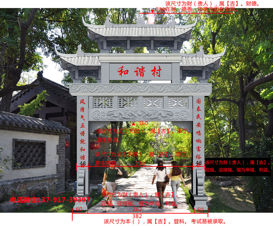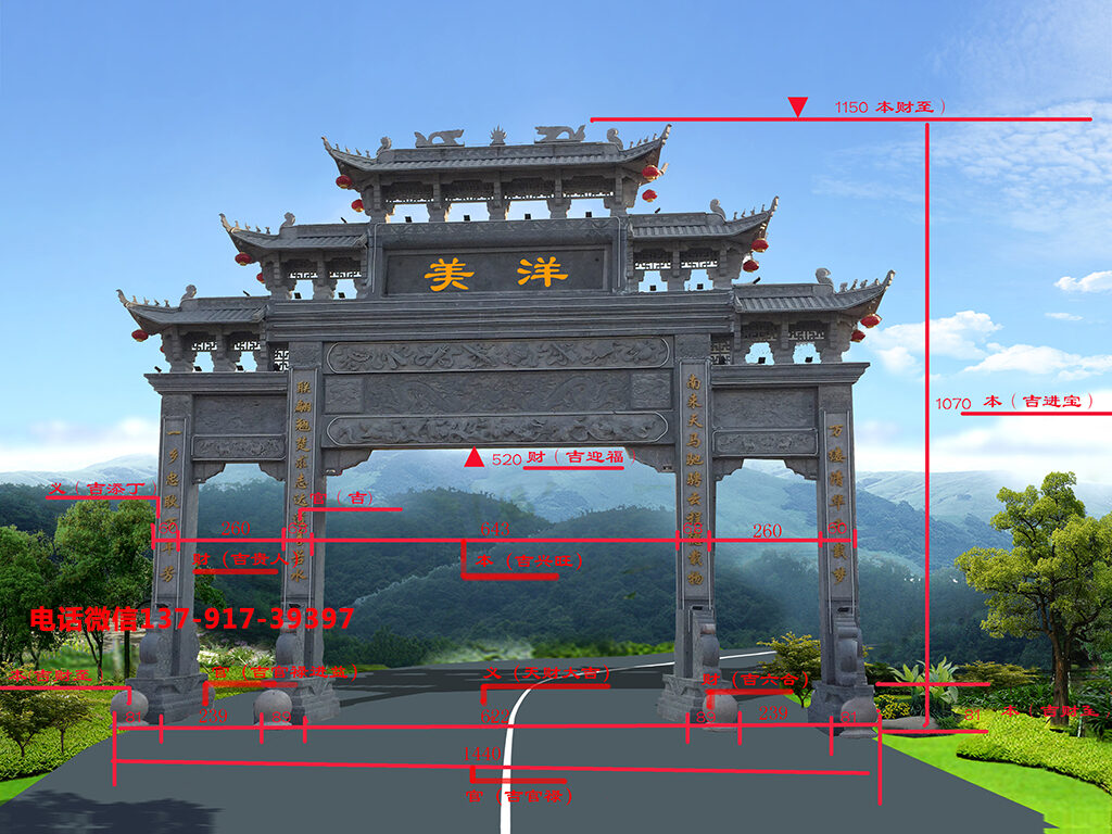 如安裝在廣東省潮州市饒平縣三饒鎮(zhèn)南聯(lián)村這座三門五樓農(nóng)村石牌坊,整體就是采用魯班尺上的吉祥尺寸來制作的,如中間大門凈寬5.36米該尺寸為義(天財(cái)),屬【吉】,大吉,寓意吉祥吉利,中門凈高4.76米該尺寸為財(cái)(貴人),屬【吉】。六合。寓意合和美滿,六合為天地四方。小門凈寬1.68米該尺寸為本,屬【吉】,登科,寓意考試易被錄取。從這里就可以看出這座牌坊大門尺寸吉數(shù)都是非常吉祥的,樣式如下;