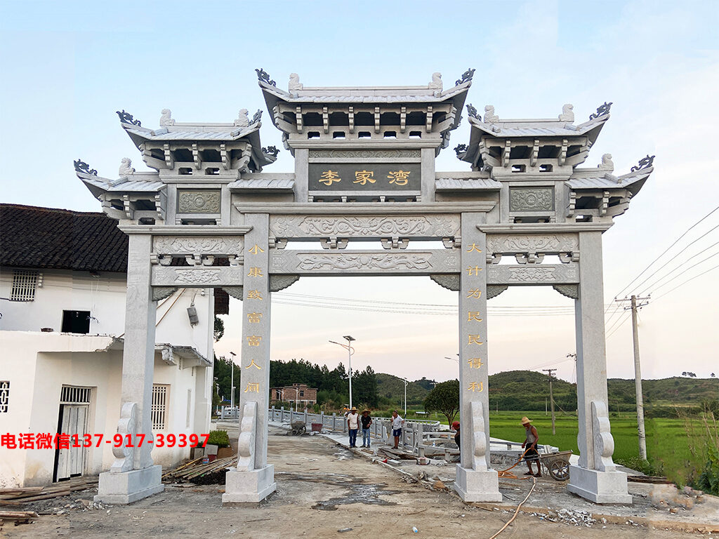 上圖三門七樓農(nóng)村入口村牌牌坊牌樓安裝在湖南衡陽耒陽李家灣村,總高8.6米,總寬10米,中門凈寬4米,凈高4.6米,小門凈寬1.85米,凈高4.35米,這座牌坊樣式復(fù)雜,牌坊價格在23萬左右,樣式如上。
