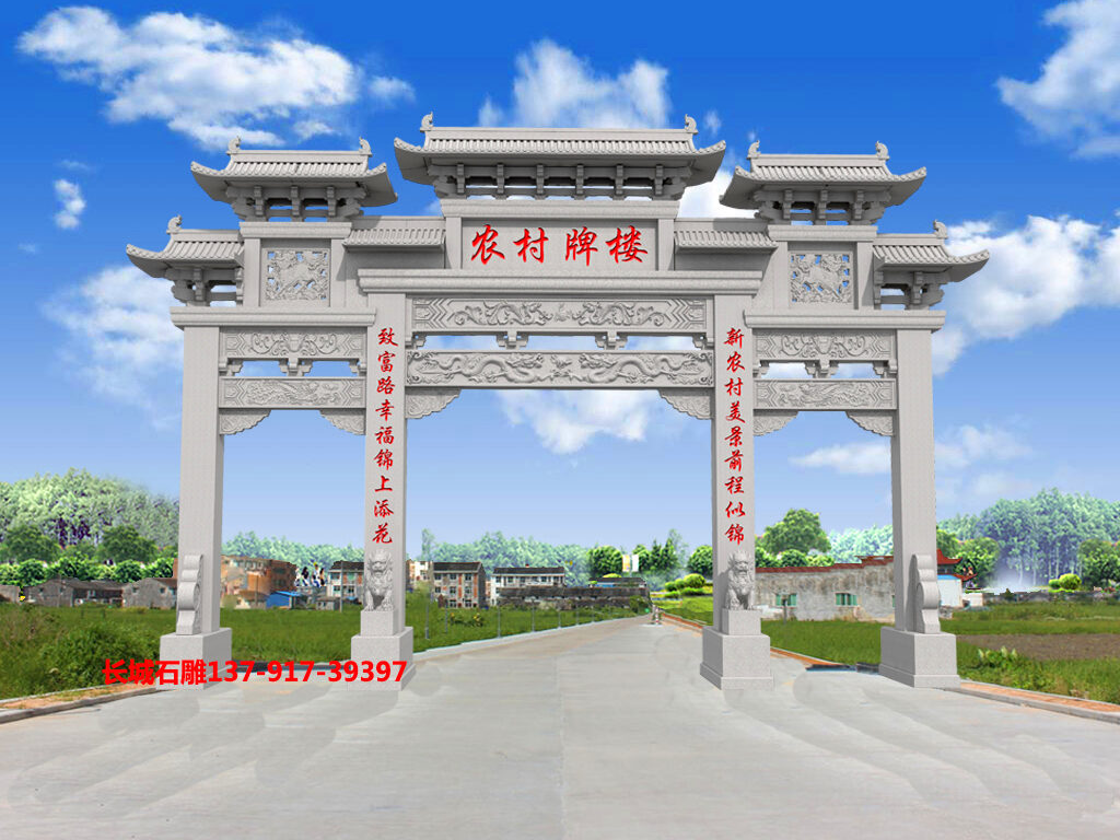 農(nóng)村牌樓也被人們稱為農(nóng)村石牌樓、農(nóng)村牌坊、農(nóng)村石牌坊、村莊牌樓、鄉(xiāng)村牌樓、村口牌樓等,在建造農(nóng)村入口石牌樓的過程中,農(nóng)村牌樓價格是人們最為關(guān)心的問題。在石牌樓制作廠家-嘉祥縣長城石雕廠提供的農(nóng)村牌樓圖片大全中,常見的農(nóng)村石牌樓樣式以一門一樓、一門三樓、三門三樓、三門五樓、三門七樓等,那么農(nóng)村牌樓價格多少錢呢?下面介紹農(nóng)村牌樓價格及圖片樣式。