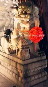 浙江建德大慈巖大慈寺石獅明(1368一1644)一對,蹲立式,置于大慈寺山門旁。圖中宕獅頭大,造型獨特,眼珠凸出,且有明顯的上眼瞼,鼻翼肥大。前肢持一小獅子,緩帶相繞成柱狀,作為支撐物口后腿特別肥大幾該獅所在的大慈寺傍巖而筑,座落于大慈巖山巔,建于元大德初年(1297),但從石雕獅子的形制看,似為明代作品。其底座很似門墩石,故石獅很可能由別處移來。