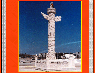 石雕華表的柱身呈八角型,一條巨龍盤旋而上,龍身外布滿云紋,漢白玉的石柱在藍天白云的烘托下真有巨龍凌空飛騰的氣勢。柱身上方橫插一塊云板,上面雕滿祥云。石雕華表的基座稱為須彌座,這是借鑒了佛教造像的基座形式,而且在基座外添加了一圈石欄桿,石雕欄桿的四角石柱上各有一只小石獅,頭的朝向與上面的石犼相同。欄桿不但對華表起到維護作用,還將華表烘托得更加高聳和莊嚴。有加官晉祿之意。華表在國歷史上又被稱作“桓表”和表,世界上獨一無二、石雕華表是我國所特有的一種具有顯著中華文化特色的象征性標識。