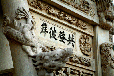 在五臺(tái)山風(fēng)景旅游區(qū),南山寺對(duì)面的山崗一下,有一座依山傍水的寺院一一龍泉寺,寺院山門外盜立著一座巨型漢白玉石雕牌坊。這幢石牌樓以其獨(dú)特的造型風(fēng)格和精湛的雕刻藝術(shù)吸引著無數(shù)中外游人。石雕牌坊位于九龍崗山腰,其圖案設(shè)計(jì)以"九"和"龍"為主題,栩栩如生的各式游龍、盤龍、飛龍、蛟龍飛騰交錯(cuò)雄踞于牌樓的各個(gè)部位,仙人、花卉、麒麟、鼓反等有規(guī)則地穿插分布其間,相輔成局。從底層的甲耳石起,到中部的柱、俄,額、梁,以至頂部的構(gòu)頭、脊頂,每個(gè)部位無不體現(xiàn)出以其地名為主題的"九龍"雕刻。石雕牌坊牌樓造型為一高二低式三開間建筑,