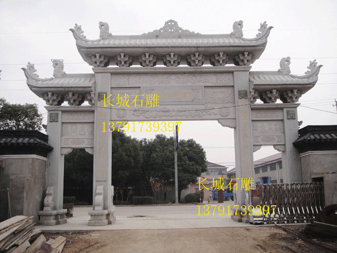 近幾年花崗巖石牌坊制作的也不較多,新農(nóng)村、風(fēng)景區(qū)、寺院石牌樓等地方都開始慢慢地接受花崗巖石牌樓,以后花崗巖石牌樓也許會和青石牌坊并駕齊驅(qū),見下圖花崗巖牌坊: